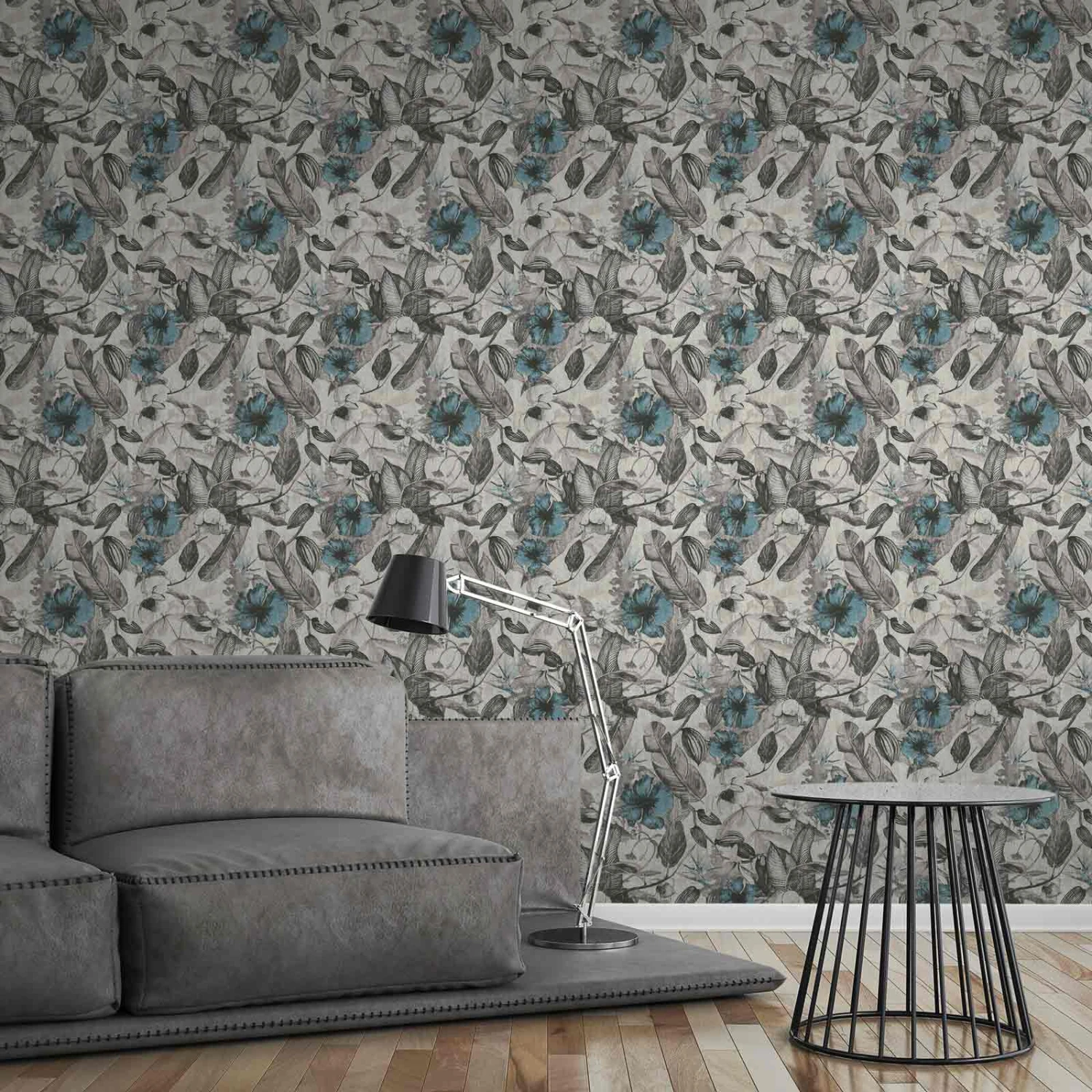 Tapete Vlies Dschungel Blumen grau-weiß blau AS Creation Greenery 37216-2 | 372162