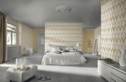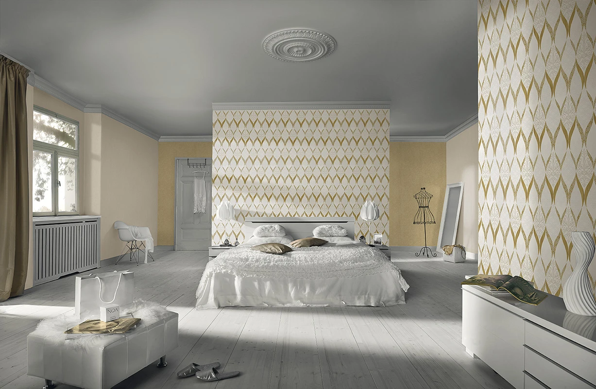Das orientalisch angehauchte Ornamentmuster der Deluxe Tapete 41006-20 hat eine filigrane Ausbrenner-Optik und wirkt durch den partiellen Einsatz von glitzernden Glasperlen besonders elegant und raffiniert. Währenddessen sorgt die Farbgebung aus weiß, gold und silber dafür, dass das Dessin perfekt in Szene gesetzt wird. Darüber hinaus überzeugt die schwere Vliestapeten-Qualität mit ihren hervorragenden Materialeigenschaften. Die GMK Tapete ist waschbeständig, hat eine gute Lichtbeständigkeit und kann bei Bedarf wieder restlos trocken entfernt werden.
