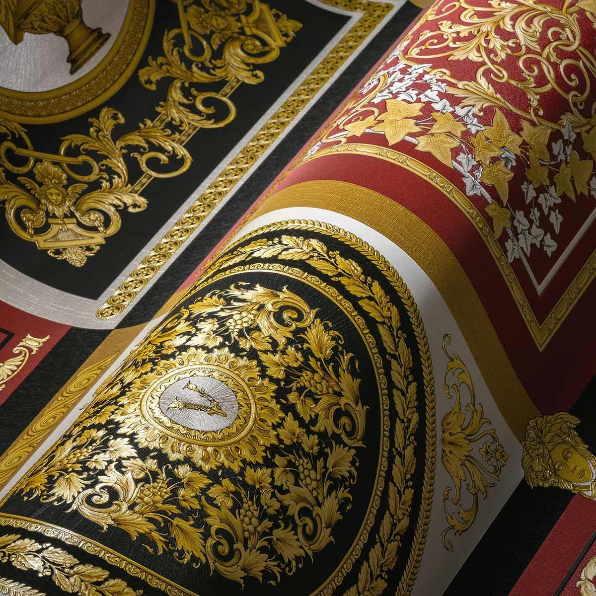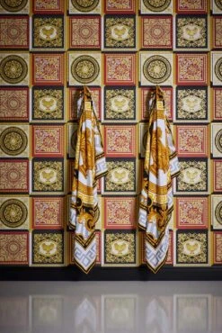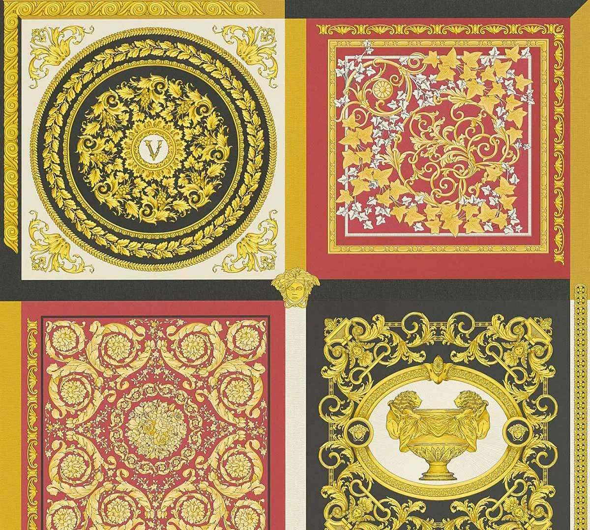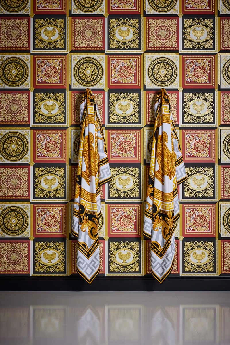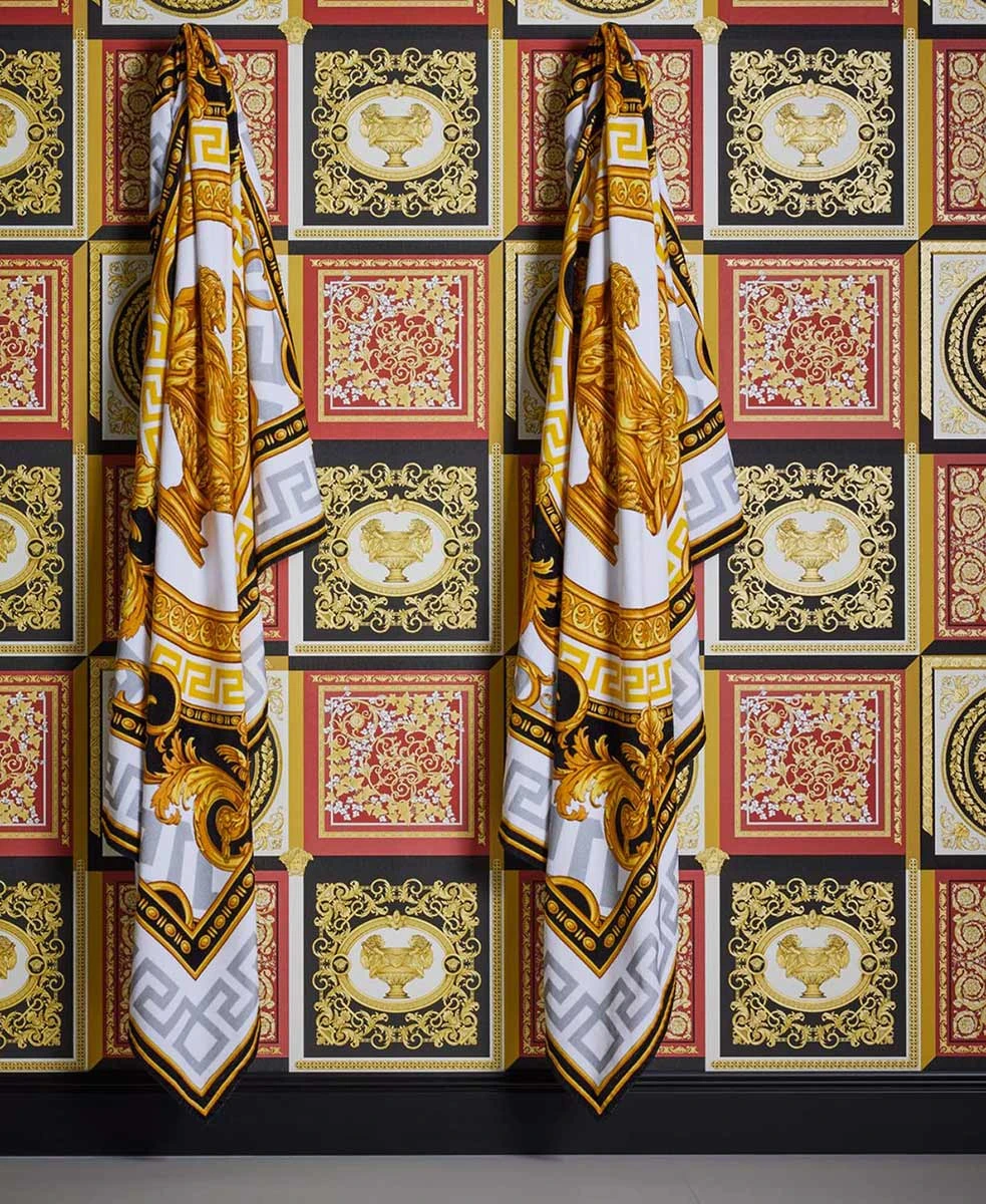 Mit den Vliestapeten der Versace Home 5 Kollektion bringen Sie den einzigartigen Stil der Luxusmarke Versace an Ihre Wände. Die Tapeten zeigen typische Versace Motive wie Medusaköpfe oder Mäandermuster. Aber auch schlichte Uni-Tapeten können Sie hier finden. Die Tapete 38704-6 in Schwarz, Rottönen und Gold besticht durch ein Motiv mit Kacheloptik im Barock-Stil. Lassen Sie sich von den Versace Home Tapeten überzeugen und entdecken Sie die komplette Kollektion bei uns im Shop.