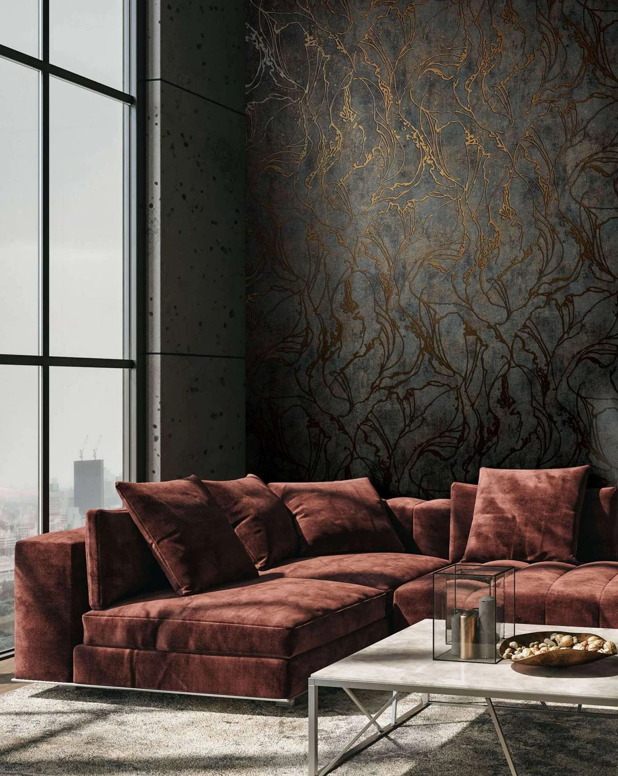 Hole dir mit den Tapeten der Kollektion City Glow von Marburg den Großstadtflair nach Hause. Die Tapeten zeigen unter anderem Blatt-, Damast- oder Wellenmuster, die gekonnt Glamour und Lässigkeit an deine Wände zaubern. Die Vliestapete 34256 zeigt ein fließendes Linienmuster mit Metallic-Effekt in Kupfer auf einem Hintergrund in Betonoptik in schwarz. Überzeuge dich auch von den weiteren Tapeten der City Glow Kollektion von Marburg und entdecke die komplette Kollektion in unserem Shop.